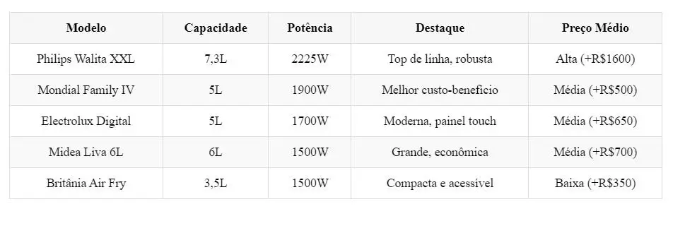 Qual air fryer é mais econômica? Modelos como Midea Liva 6L e Britânia Air Fry são extremamente econômicos, com potências de 1500W e ótimo desempenho.