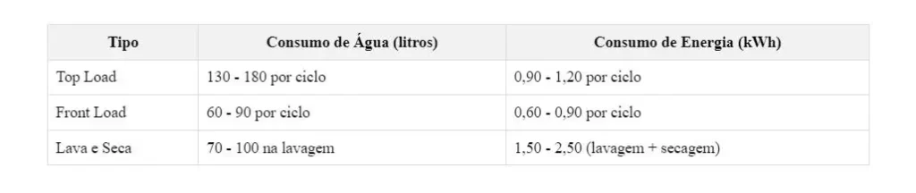 A máquina Top Load gasta em média 130 a 180 litros de água por ciclo. Já a Front Load usa bem menos, cerca de 60 a 90 litros. A Lava e Seca, na função lavar, também é econômica, mas quando entra na secagem, o consumo de energia sobe bastante.